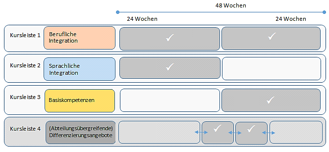 Aufgrund der Tatsache, dass für die einzelnen Bedarfsgruppen häufig nicht genügend Teilnehmer zur Einrichtung einer spezifischen Maßnahme zur Verfügung stehen, ergibt sich die Notwendigkeit, kombinierte Kurse einzurichten, die aber gleichwohl eine zielgerichtete und zieldifferente Förderung ermöglichen.