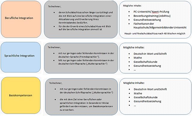 - deren Schulabschluss schon länger zurückliegt und die mit Blick auf eine berufliche Integration einer Aktualisierung und Erweiterung ihres Kenntnisstandes bedürfen.